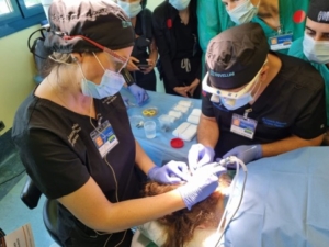 Dedicated to Long Hair FUE Eyebrows Restoration, this room highlighted techniques for eyebrow drawing, long hair harvesting, and follicular unit insertion. Dr. Laura Caicedo Albariello demonstrated harvesting long hair using Trivellini’s machine, assisted by Dr. Leoncio Moncada. The placing procedure was expertly handled by Dr. Felipe Pittella using sharp Lion implanters. The curvature of the angle and direction of the grafts was significantly enhanced by the use of long hair.